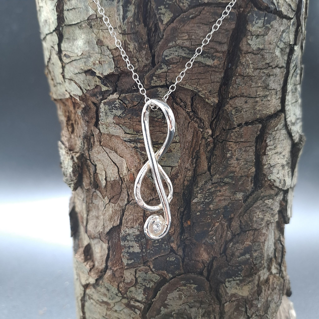 45mm pure silver treble clef, with cubic zirconia on a ss chain